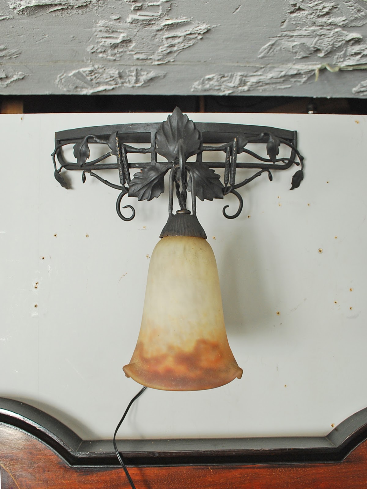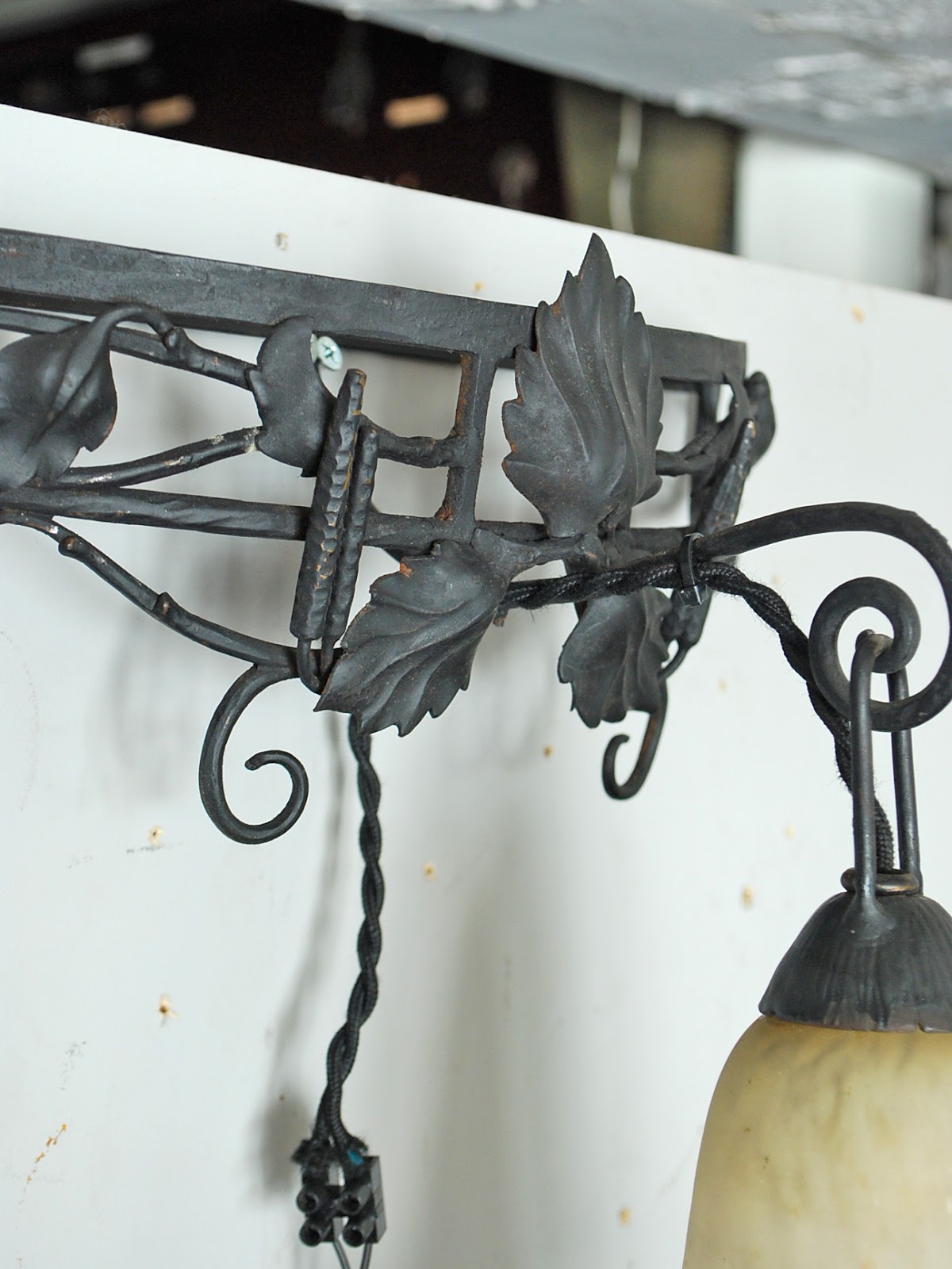 黒いコンソールのようなアイアンに蔦の葉が絡まり、シェードがぶら下がっています。